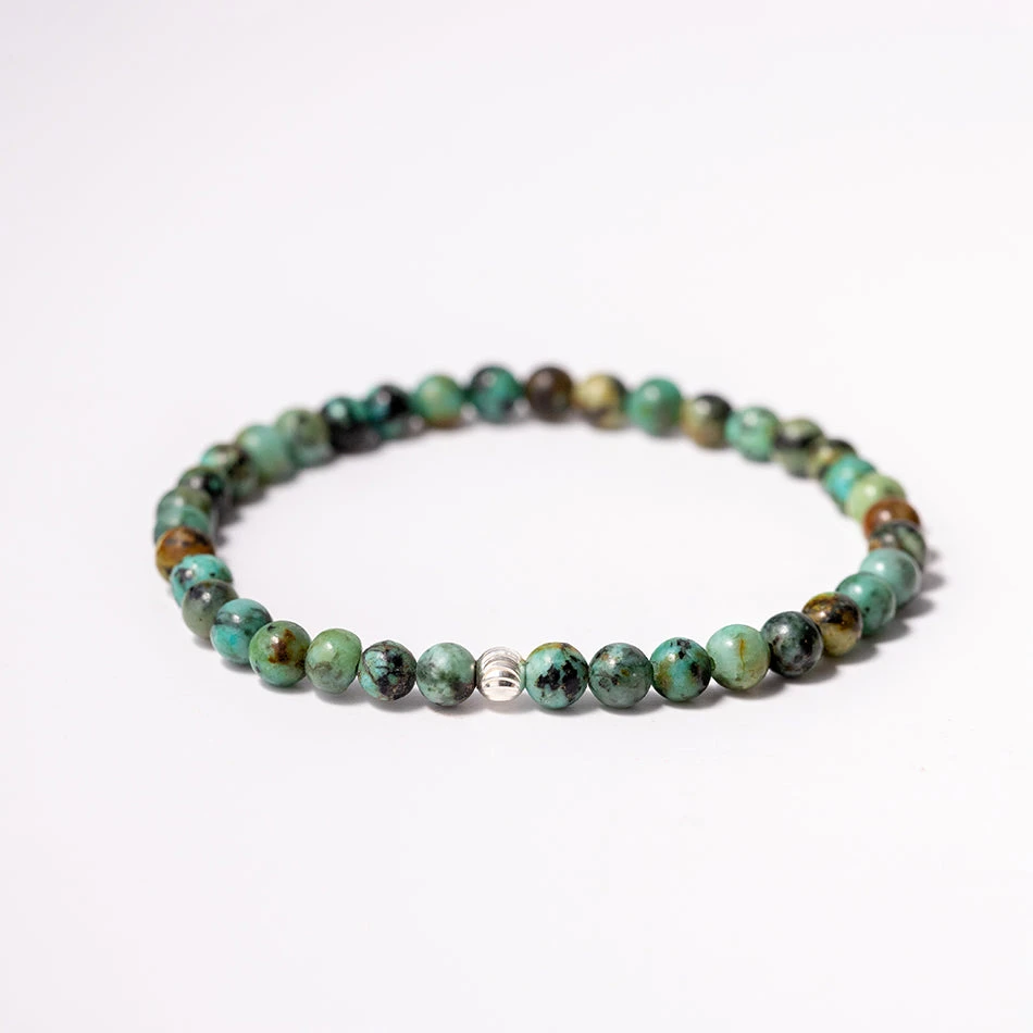 Bead Size and Appearance: The beads in this bracelet are 4mm in diameter, creating a delicate and refined look. These beads showcase the intricate patterns and hues that are characteristic of African Jasper. The colours can include various shades of greens, blues, browns, and sometimes even hints of mustard or reddish tones. The beads may feature mottled patterns, veining, and occasional natural inclusions, giving each bead a unique and organic appearance.