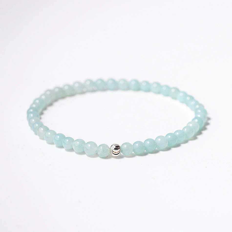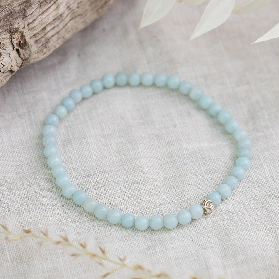 Amazonite is a soothing stone. With it’s beautiful soft pastel colours it calms the brain and nervous system and aids in maintaining optimum health.ย This gemstone bracelet is made with Grade A authentic gemstone beads.ย Includes a half moon cut sterling silver feature bead.
