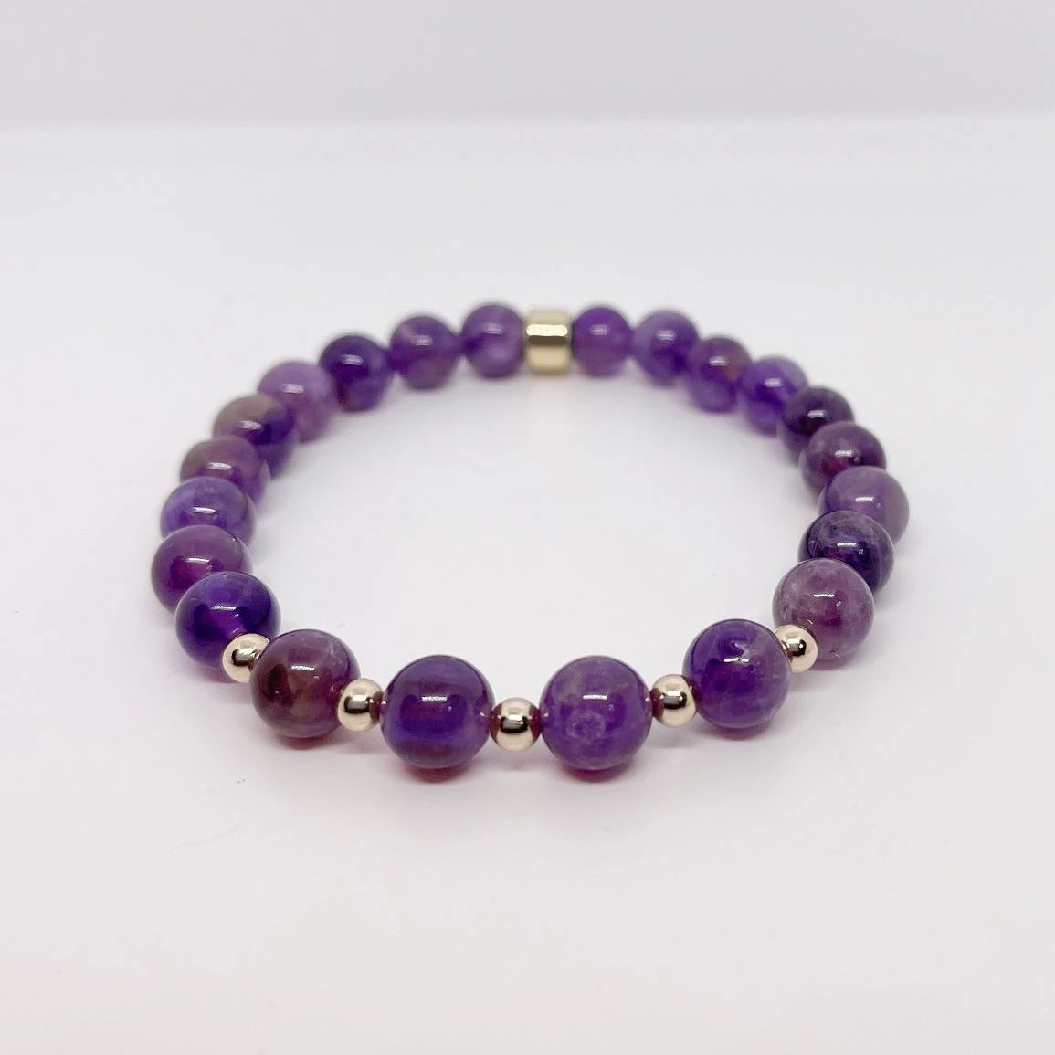 This bracelet features genuine 8mm Amethyst beads paired with gold filled accent beads.