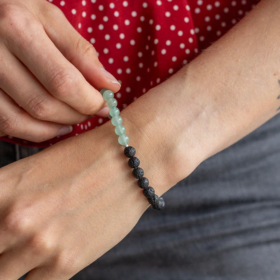 njoy your favourite essential oils wherever you are with this lava stone aromatherapy diffuser bracelet. The bracelet features Aventurine beads with sterling silver accent beads.