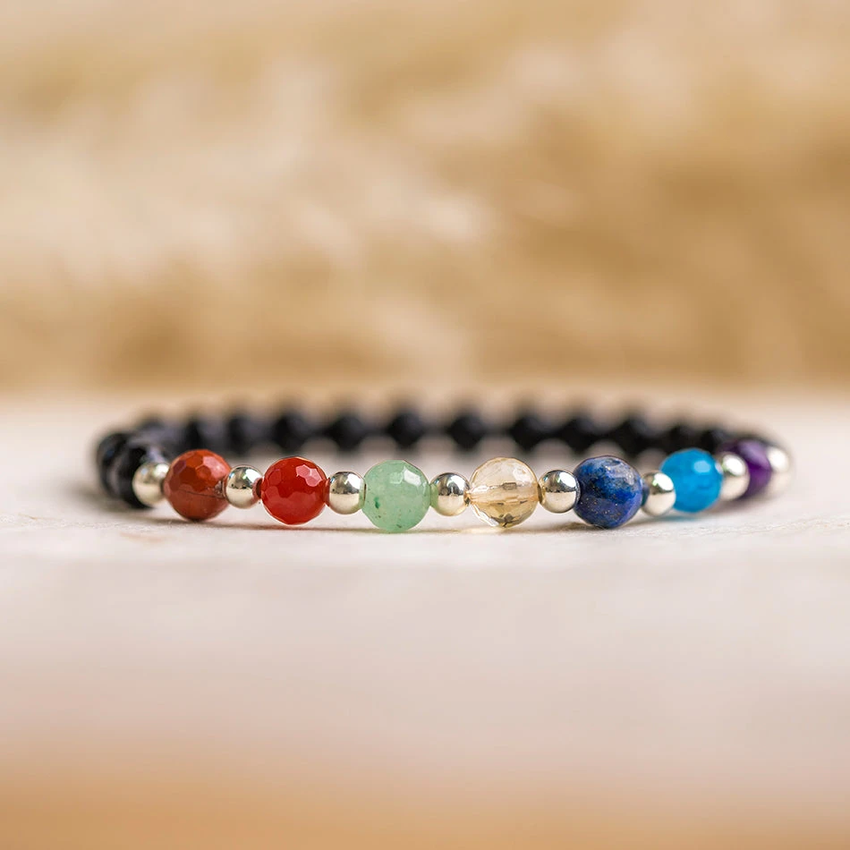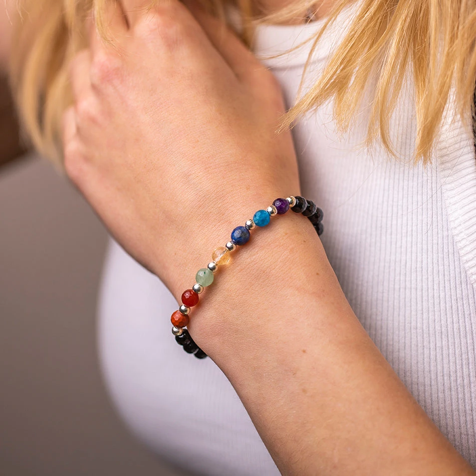 This stretch bracelet is made with 6mmΒ Β 7 Chakra StonesΒ and 6mmΒ Black Tourmaline StonesΒ withΒ 4mm sterling silver accent beads.