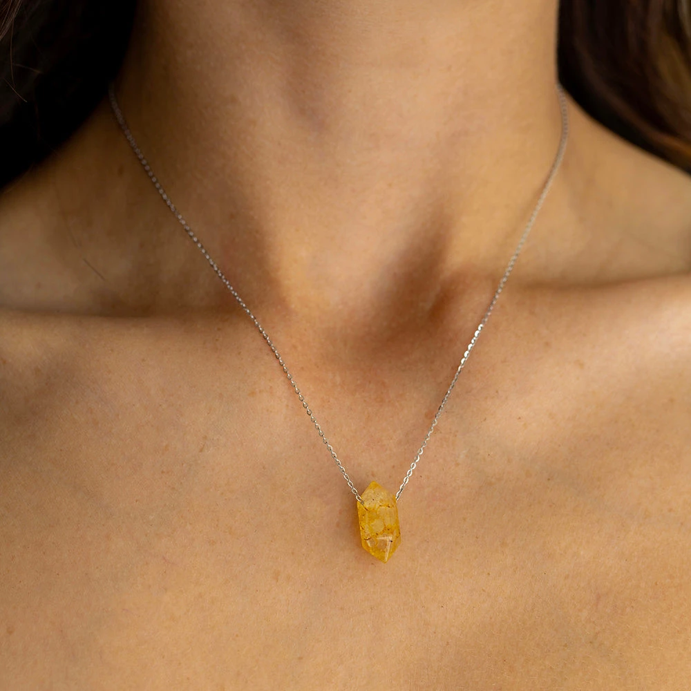 Bright, energising, and full of optimism – this Citrine double-point necklace is a wearable reminder of your inner light. Suspended from a 16″ adjustable chain in your choice of 14k gold-filled or sterling silver, it’s designed to sit close to the heart and radiate warmth throughout your day.
