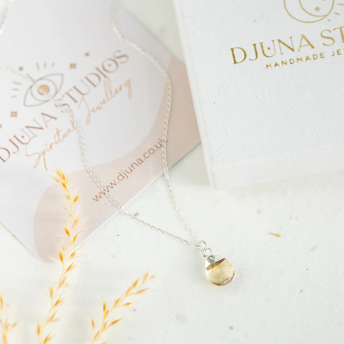 Each pendant features a tiny teardrop-shaped citrine stone, meticulously tumbled to perfection to reveal its smooth, organic shape and showcase its stunning natural colour.