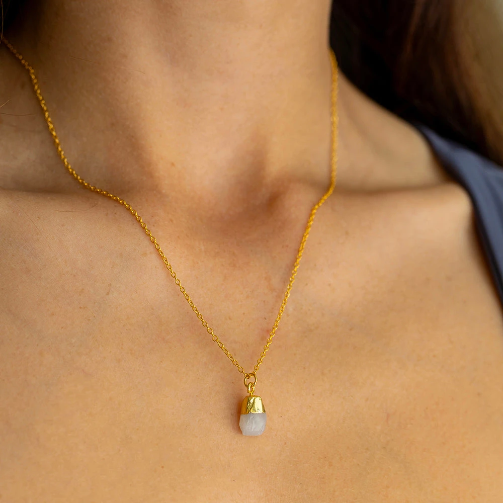 Bright and grounding, this raw Clear Quartz pendant is a powerful symbol of clarity, strength, and inner light. Naturally formed and dipped in gold, it’s suspended from a 16″ 14k gold-filled chain, designed to be worn close – a luminous reminder of your resilience.