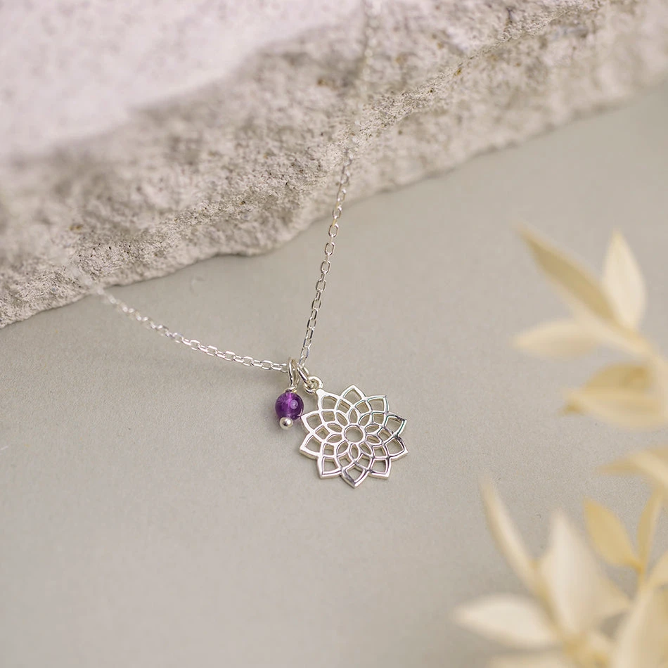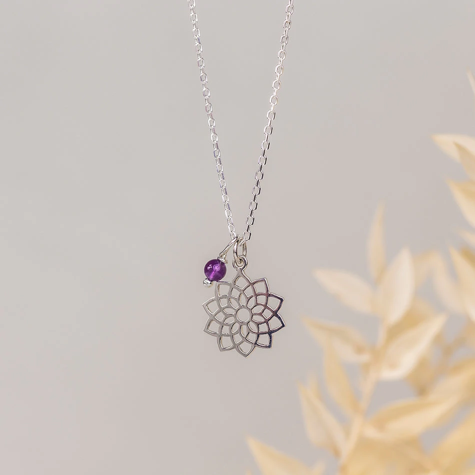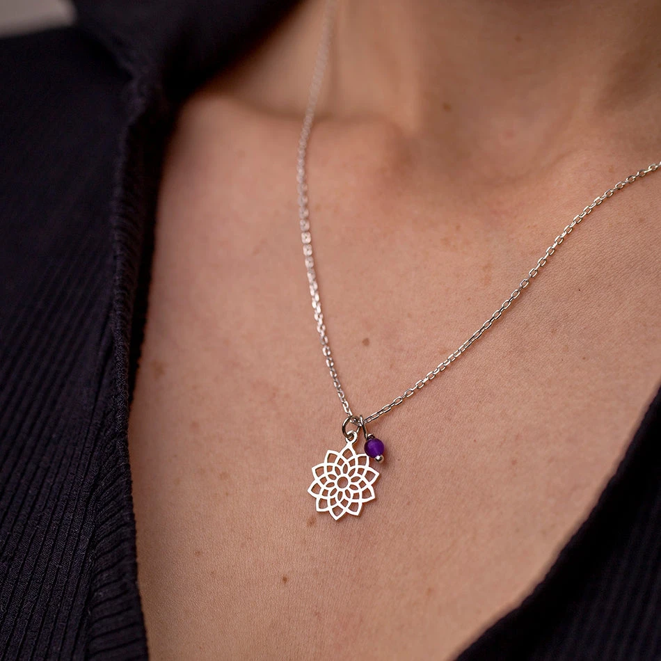 Our sterling silver Crown Chakra necklace is available in 4 different lengths and includes a 4mm Amethyst polished bead charm.