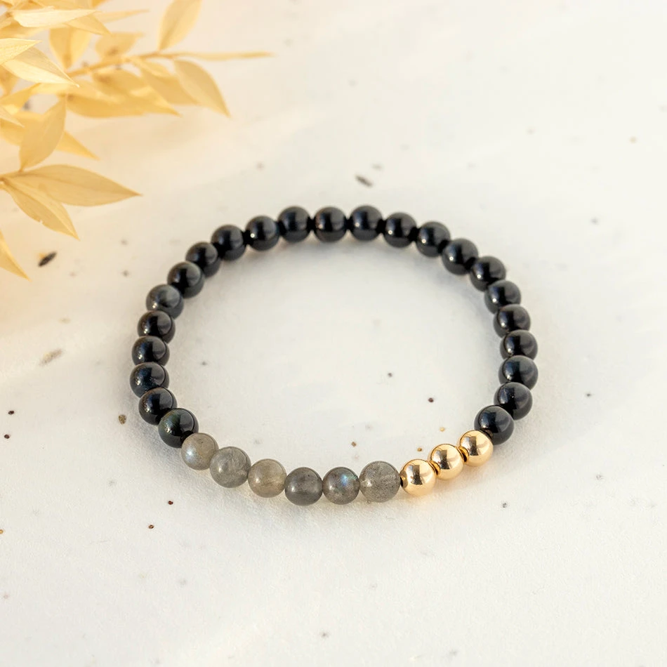 Embrace the protective and transformative energies of labradorite and black tourmaline, enhanced by the elegance of gold accents. This exquisite bracelet is a symbol of mystic beauty and strength, perfect for enhancing your style and spiritual journey.
