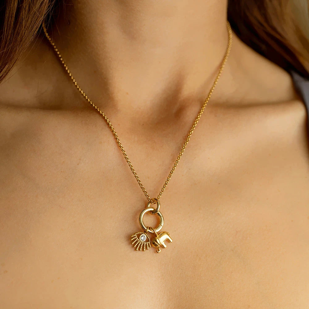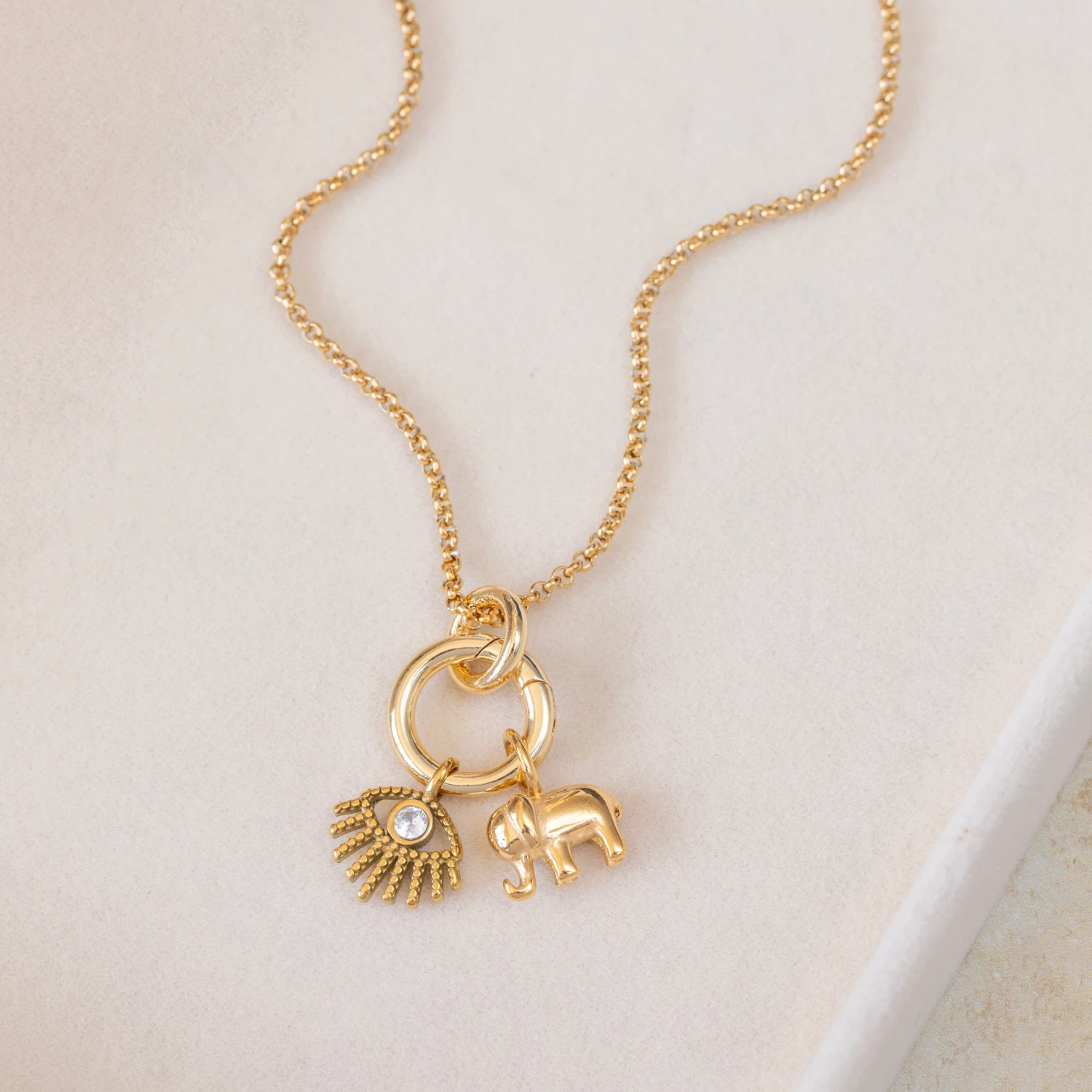 A powerful blend of protection and positivity, this charm necklace brings together two meaningful symbols on one beautifully crafted piece. The design features a 13mm spring fastener that holds an evil eye pendant (1.5cm x 1.5cm) and an elephant charm (1.4cm x 1.05cm), both suspended from a 22K gold plated sterling silver belcher chain measuring 45cm with a 5cm extender.