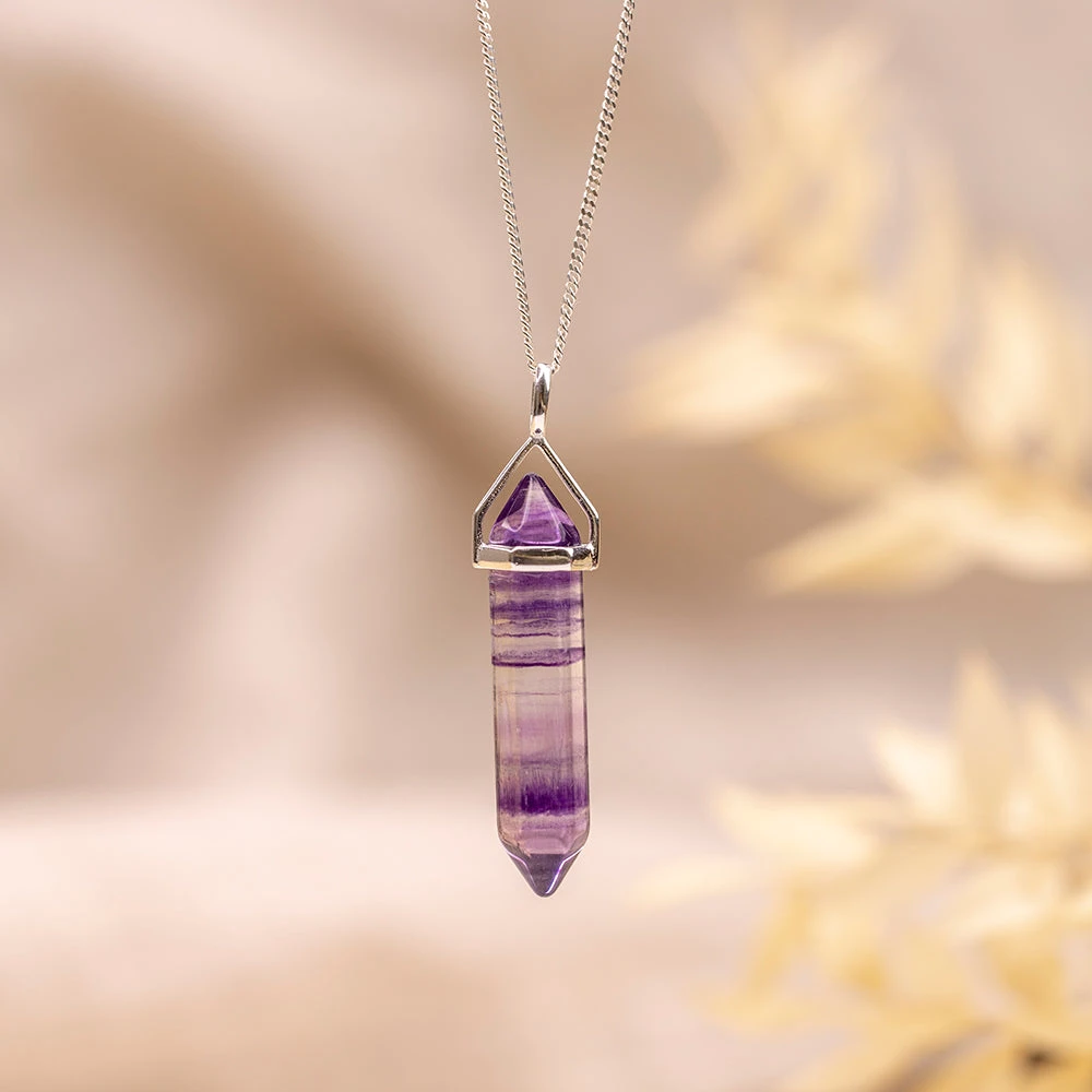 ThisĀ Fluorite DoubleĀ Point Pendant measuresĀ approximately 3.5cm in lengthĀ and is of a beautiful quality. Made with 925 sterling silver capped style bail.Ā A 925 sterling silver curb style chain is included, available in four differernt lengths. This has to be the most stylish way to wear your favouriteĀ Fluorite crystal!