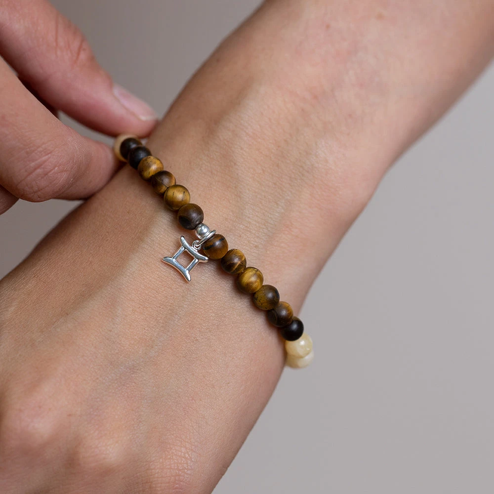 This unique birthstone bracelet features a stylish sterling silver Gemini charm and shaped tubular spacer bead.