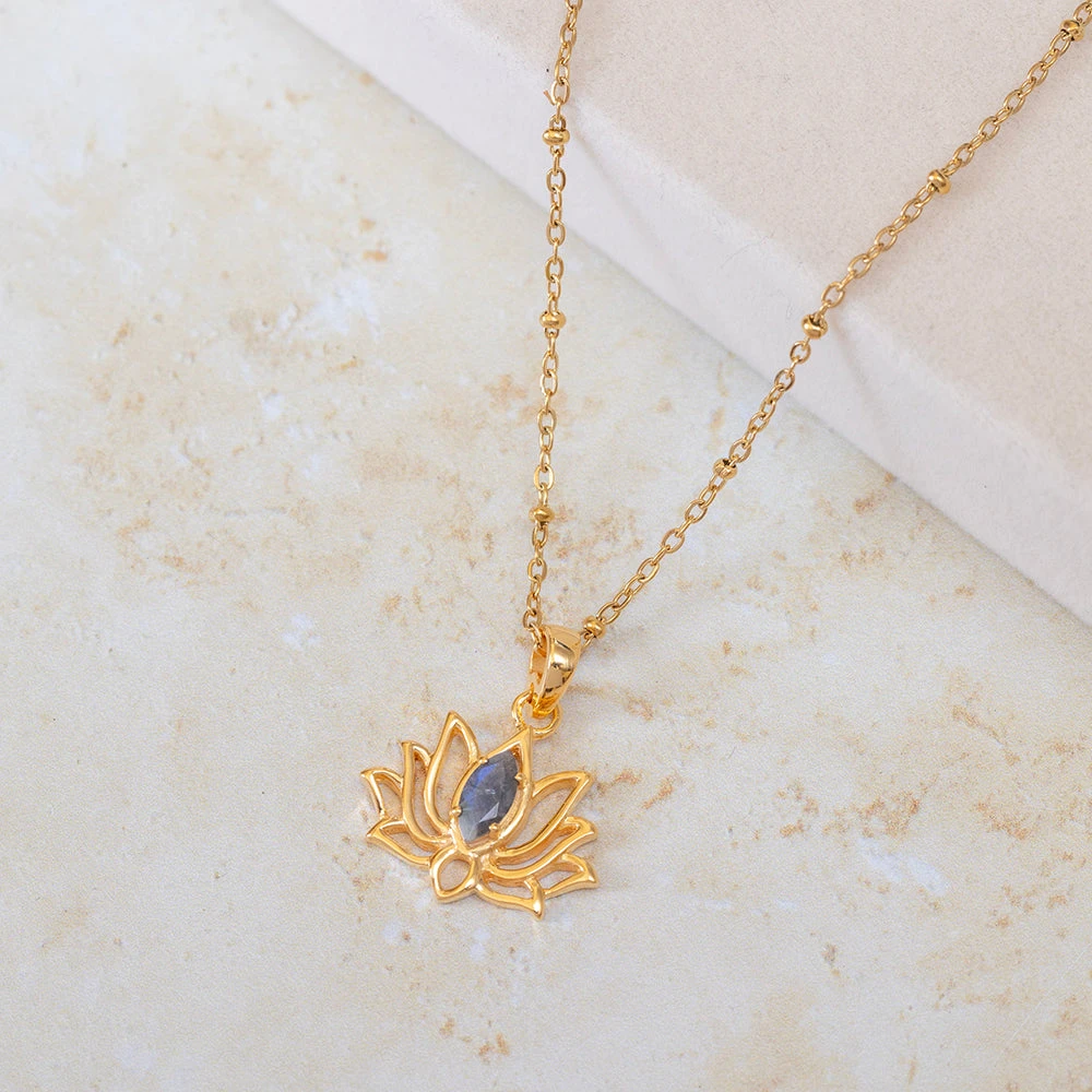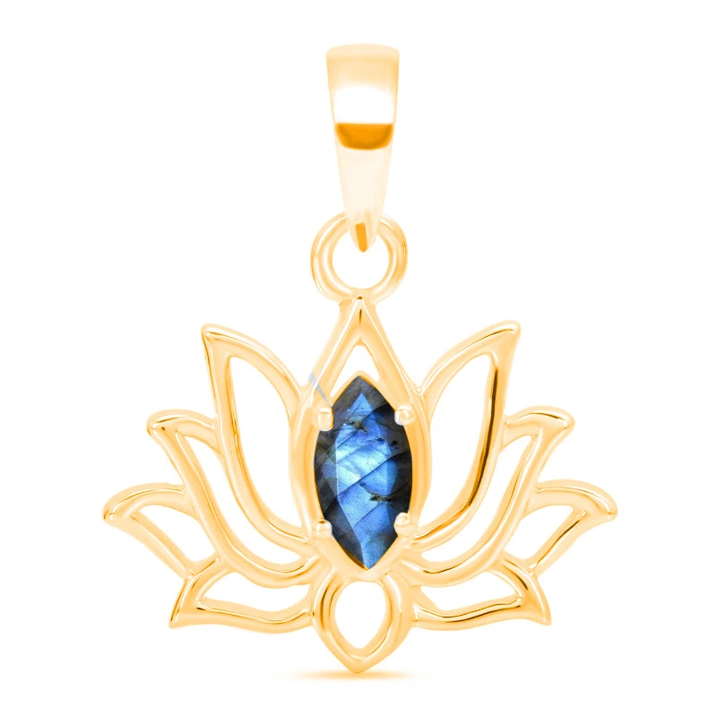 This stunning necklaces serves as a reminder of transformation and strength – Gold Vermeil Lotus Pendant features a shimmering marquise-cut labradorite stone (4x8mm) at its centre. Set within a graceful lotus design, the pendant symbolises growth, renewal, and spiritual awakening – the lotus rises from muddy waters to bloom in light, making it a meaningful emblem of resilience and new beginnings.