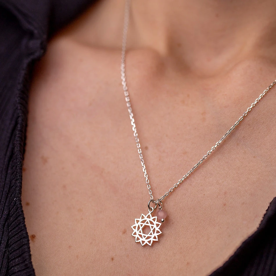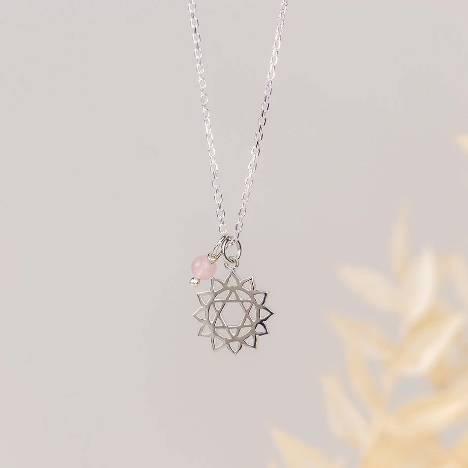 Our sterling silver Heart Chakra necklace is available in 4 different lengths and includes a 4mmΒ rose quartzΒ polished bead charm.