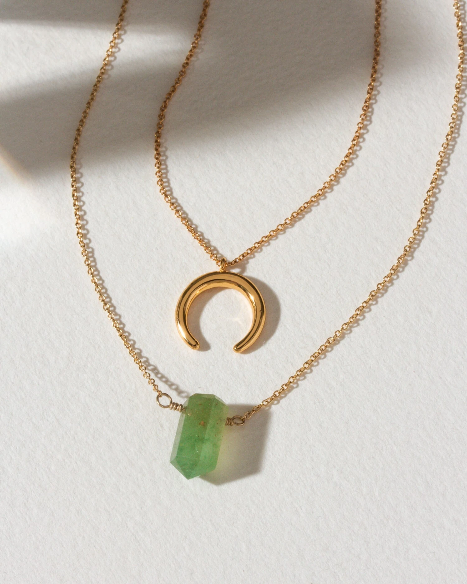 Layered with intention, this gemstone necklace set features two delicate 14k gold-plated chains – one adorned with a faceted Green Aventurine point, the other with a sleek crescent charm. Known as the stone of growth and abundance, Green Aventurine opens the heart and invites new beginnings.