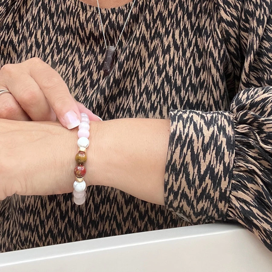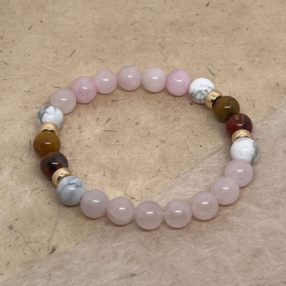 We bring together the nurturing qualities of Rose Quartz, the grounding energy of Petrified Wood, and the calming essence of White Howlite. This bracelet is a tribute to the harmonious blend of love, wisdom, and tranquility.