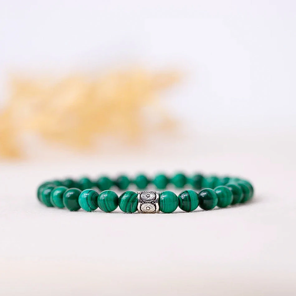 This is a gorgeous bracelet made of malachite gemstones and sterling silver accents. The highly polished 6mm beads are strung on strong stretch elastic for an easy and comfortable fit. And we can custom make this bracelet to suit your wrist size, so it’ll be a perfect fit every time!