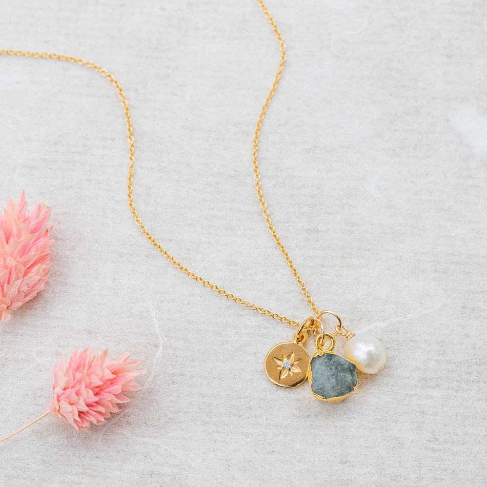 We’ve paired it with ourย north starย charm and a peridot natural stone in raw edged form, which means that this necklace will look great with any outfit, but also give you something special and unique to wear whenever you want it.