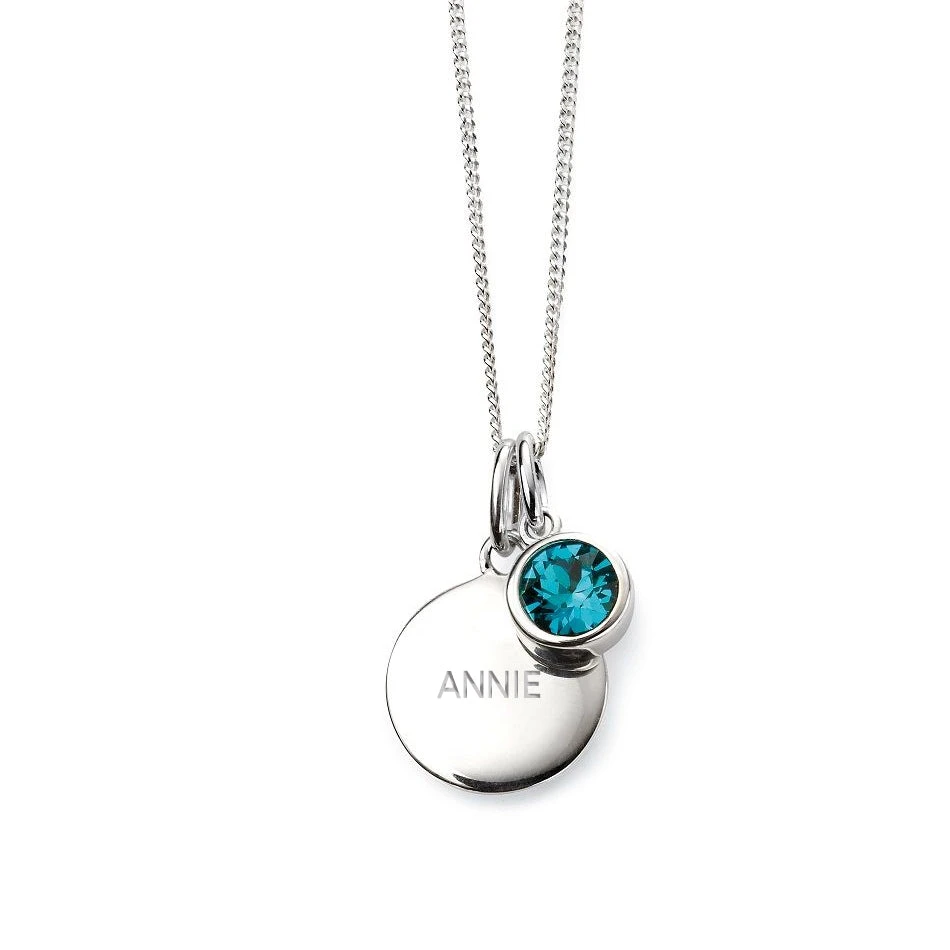Sterling Silver engraved birthstone necklace for December. Featuring a sterling silver charm engraved with any name, word or initial of your choice – from 1 up to 12 characters. This elegant necklace is paired with a beautiful Swarovski Blue Zircon Crystal. TheΒ December birthstone is for those born under the sign of Capricorn. Both charms are included on a sterling silver chain for style and elegance. The chain isΒ a diamond cut curb chain measuring 16″ in length. If you require the chain in a different length, please select from the menu.