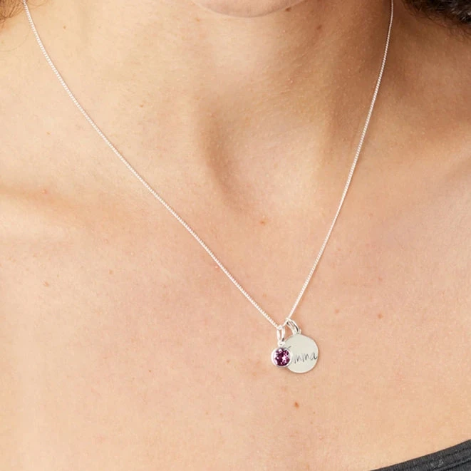 Sterling Silver engraved birthstone necklace for February. Featuring a sterling silver charm engraved with any name, word or initial of your choice – from 1 up to 12 characters. This elegant necklace is paired with a beautiful Swarovski Amethyst Crystal. TheΒ Feburary birthstone is for those born under the sign of Pisces. Both charms are included on a sterling silver chain for style and elegance. The chain isΒ a diamond cut curb chain measuring 16″ in length. If you require the chain in a different length, please select from the menu.