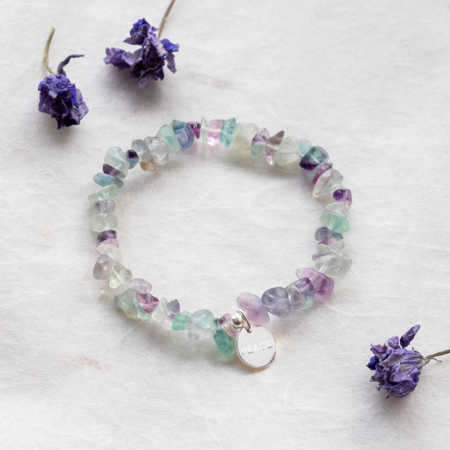 This Fluorite bracelet is made with crystal chips that measure at least 5mm. Each raw chip has been tumbled so that they appear highly polished. If you would like this bracelet made to measure, feel free to select the size above. To make this bracelet extra special it comes with a sterling silver disc charm (13mm) which can be engraved with your initial(s) or any name up to 8 characters. Include full stops for initial letters, if required.