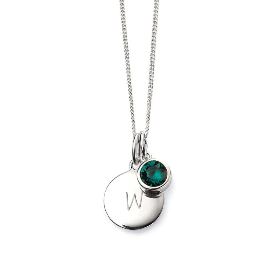 Sterling Silver engraved birthstone necklace for May. Featuring a sterling silver charm engraved with any name, word or initial of your choice – from 1 up to 12 characters. This elegant necklace is paired with a beautiful Emerald Swarovski Crystal. The May birthstone is for those born under the sign of Gemini. Both charms are included on a sterling silver chain for style and elegance. The chain is a diamond cut curb chain measuring 16″ in length. If you require the chain in a different length, please select from the menu.