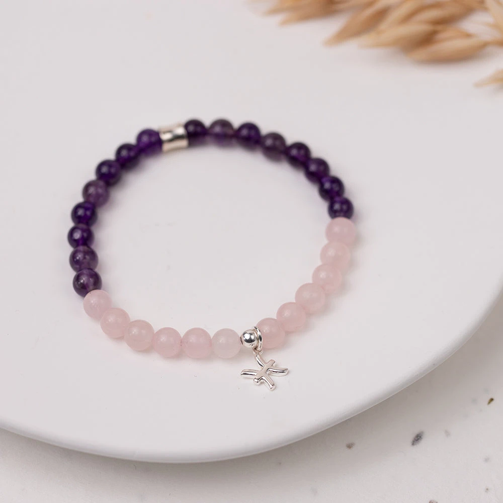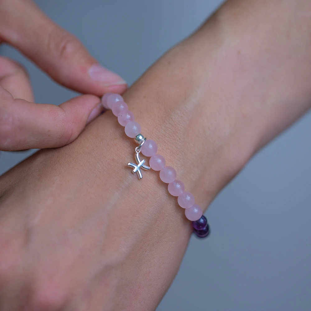 This unique bracelet features a sterling silver Pisces charm and shaped tubular spacer bead.