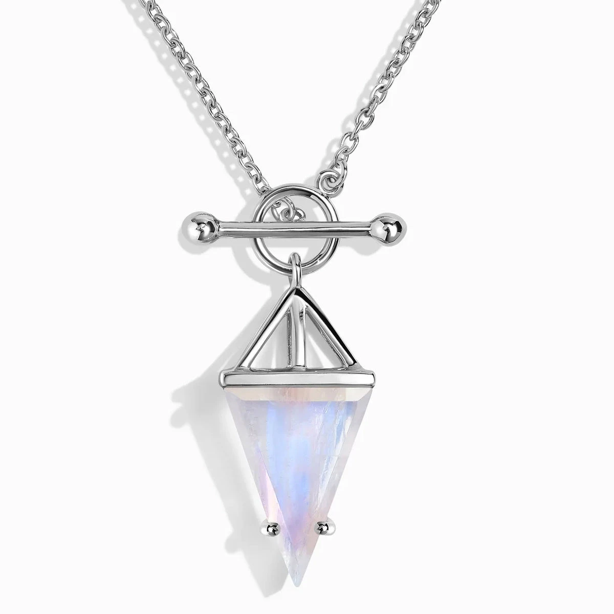 Embrace celestial grace with the Lunar Empress Necklace, a piece that embodies the essence of feminine power and celestial beauty. This exquisite necklace features a radiant rainbow moonstone, meticulously cut into a striking downward-pointing triangle, symbolising the grounding and nurturing energy of the moon.