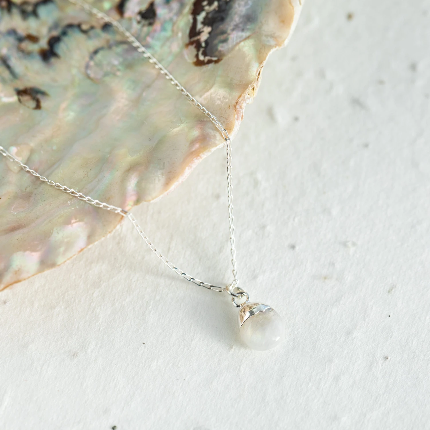 A teardrop Rainbow Moonstone Pendant, lightly dipped in silver and suspended from a fine sterling silver chain.