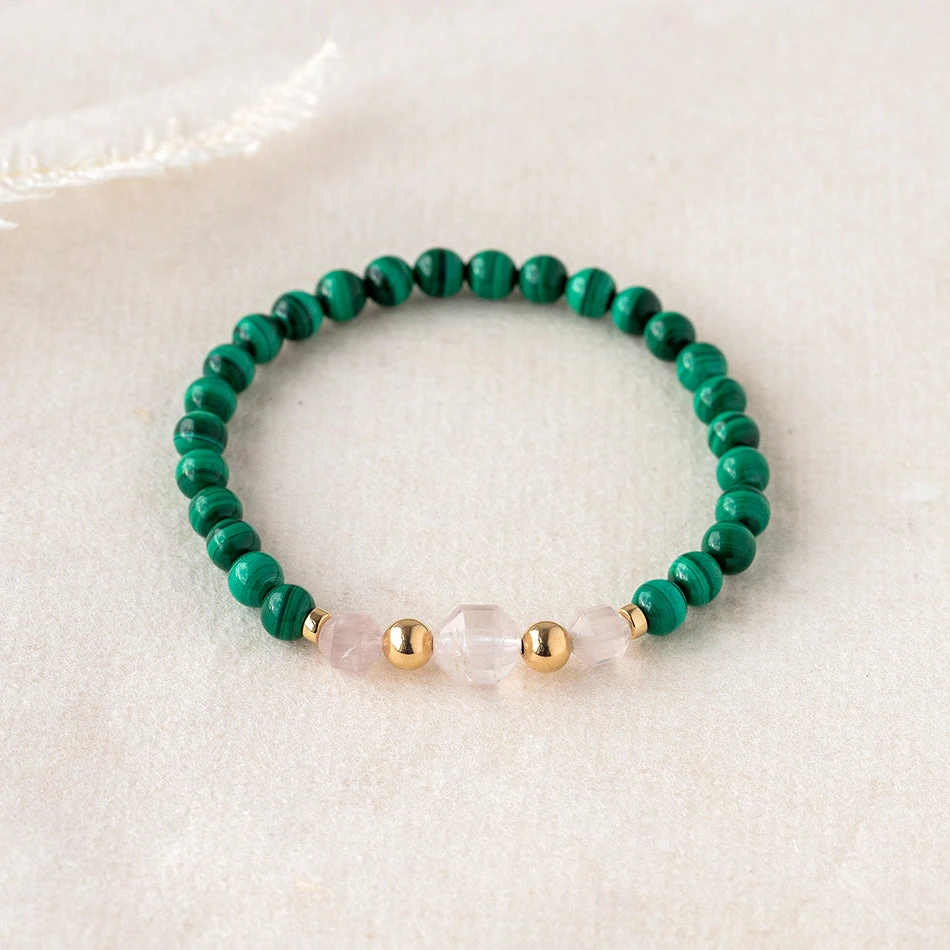 Our Self Empowerment gemstone bracelet is made up of Malachite and Rose Quartz, two stones that are known for their ability to promote self-love. Malachite has a rich, deep green colour that has been associated with healing for thousands of years. It is also thought to have the power to protect from negative energy and emotions, as well as bring good luck.