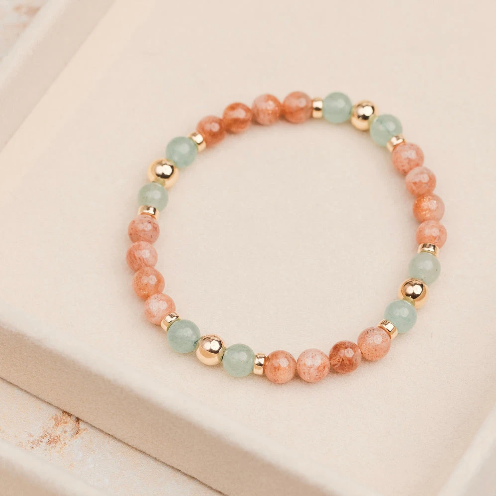 Radiate joy and fresh energy with this handcrafted bracelet featuring 6mm Sunstone and Aventurine beads. Celebrated for their uplifting and harmonising properties, these natural gemstones are paired with genuine gold-filled accents for a warm, sunlit touch. Each bracelet is carefully strung on high-quality stretch cord, offering a comfortable and durable fit for everyday wear.