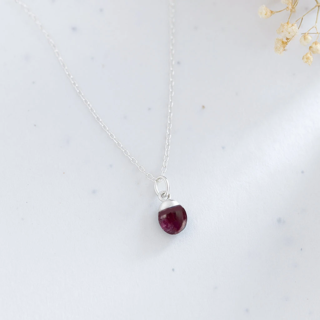 A teardrop Ruby Pendant, lightly dipped in silver and suspended from a sterling silver chain.