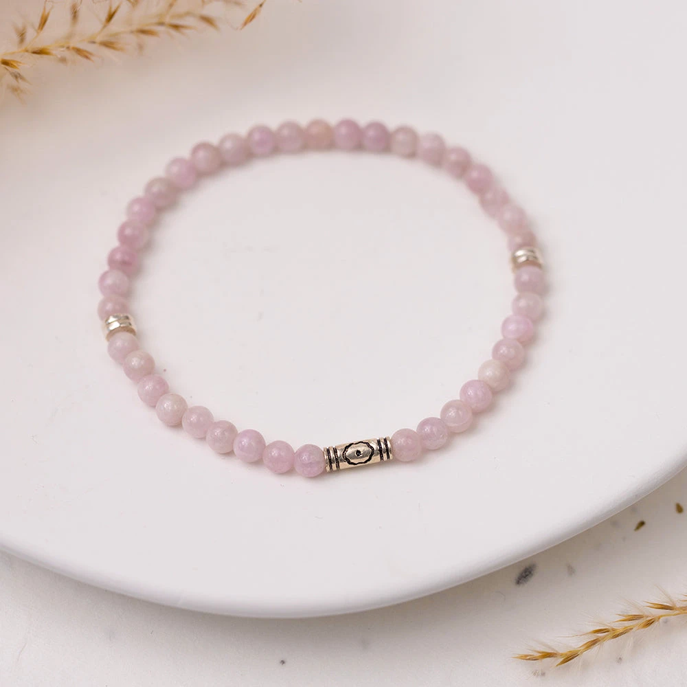 Pink gemstone bracelet with Grade A 4mm beads strung on strong stretch elastic. With sterling silver accents.