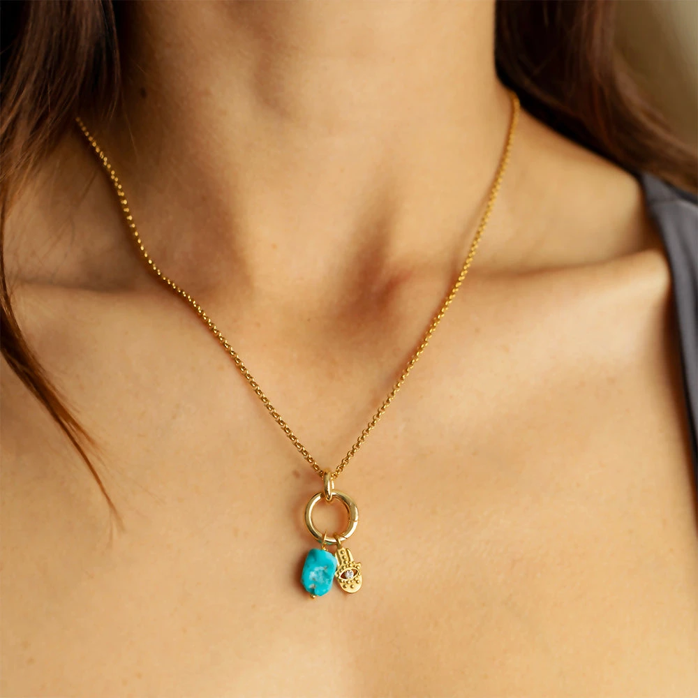 A raw turquoise pendant on a minimalist 20mm threaded hoop, known for its calming energy and association with healing, protection, and wisdom.