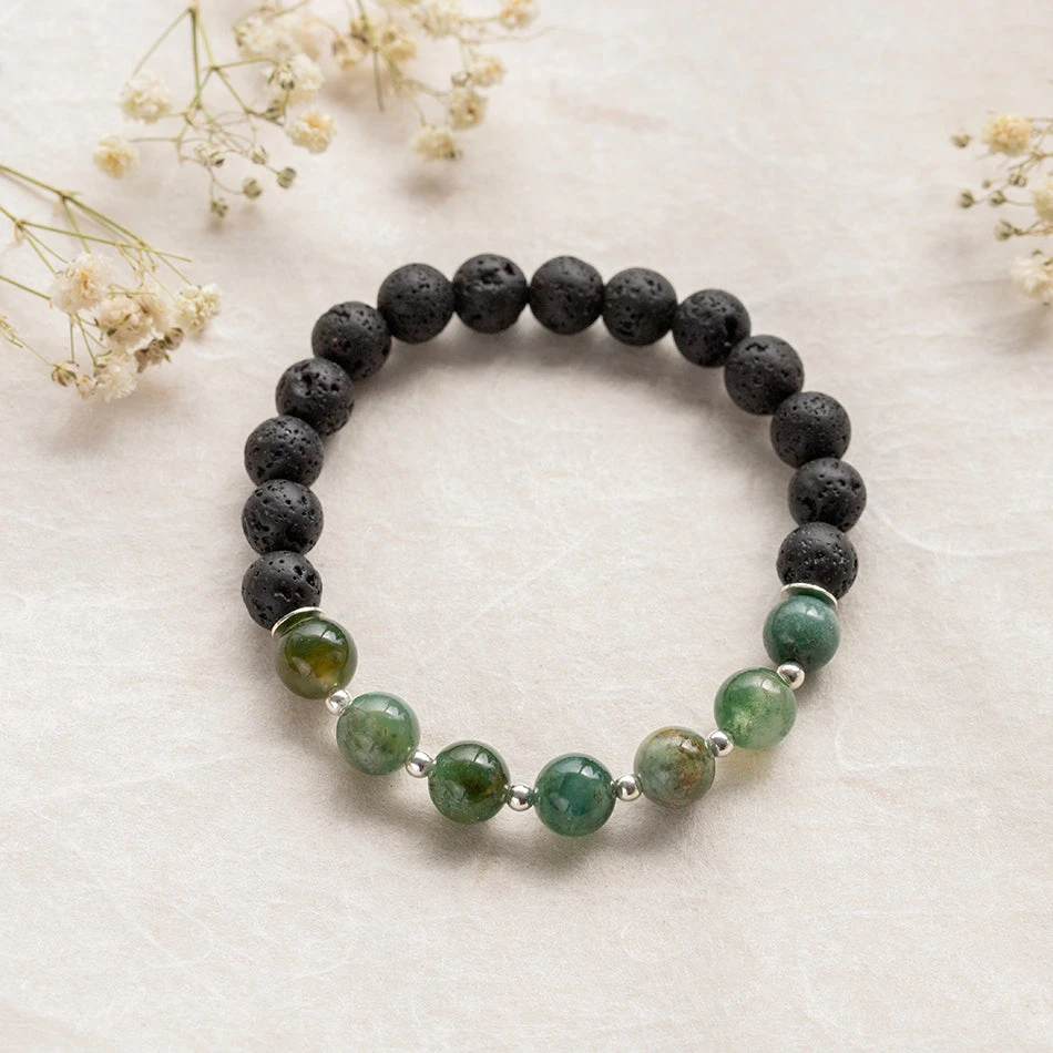 - Moss Agate & Lava Stone Beaded Bracelet – A beautiful stretch bracelet featuring sterling silver accent beads, designed to support emotional balance and clarity.